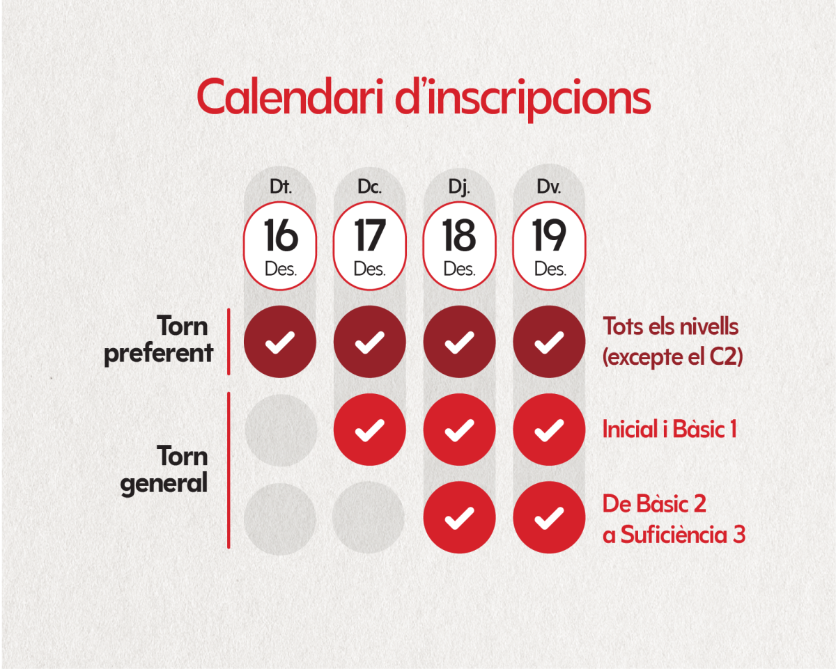 Les dates per a fer la inscripció seran el dimarts 16 de desembre (antics alumnes), dimecres 17 de desembre (cursos Inicial i Bàsic 1) i dijous 18 i divendres 19 de desembre (resta de cursos excepte C2) de 2025.