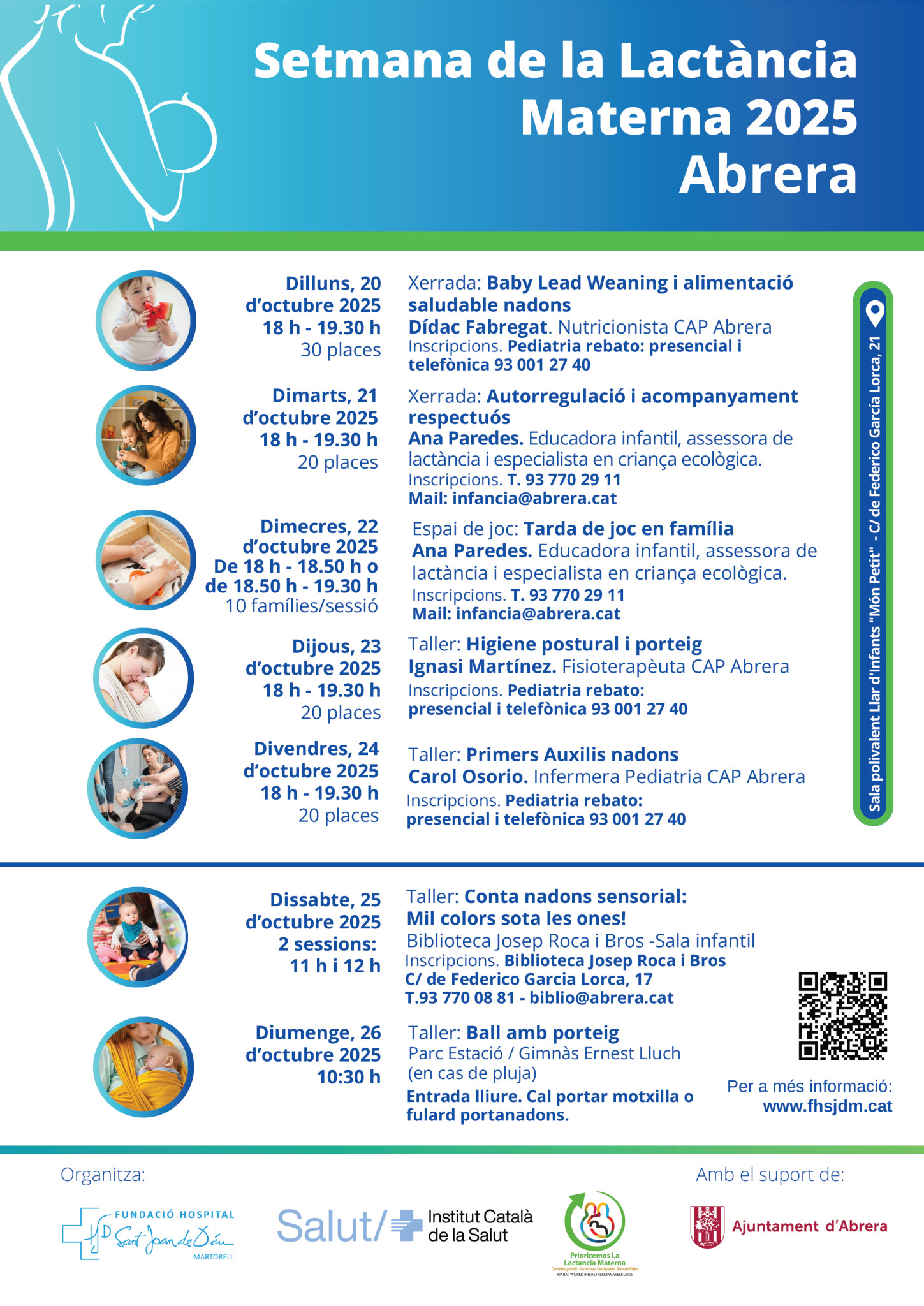 La Setmana de la Lactància Materna és una iniciativa organitzada per la Fundació Hospital Sant Joan de Déu de Martorell (FHSJDM) i inclou totes les poblacions de l’àrea d’influència de l’hospital. Per donar més visibilitat a l’alletament matern, la FHSJDM, juntament amb l’ASSIR  i els EAP Baix Llobregat Centre i Nord – Gerència d’Atenció Primària a la Comunitat Baix Llobregat i amb el suport dels Ajuntaments del Baix Llobregat Nord, s’uneixen de nou per a promoure la lactància materna. L’acte inaugural se celebrarà a Martorell el dissabte, 18 d’octubre a la Plaça de les Cultures. A Abrera, les activitats s'impartiran a l'Escola Bressol Municipal Món Petit (Federico Garcia Lorca, 21 - c. Antoni Gaudí, 4), a la Biblioteca Josep Roca i Bros (c. de Federico García Lorca, 17) i al Parc de l'Estació.