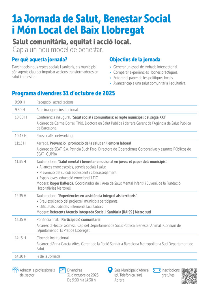 L’Ajuntament d’Abrera, a través de la Regidoria de Salut Pública, organitza la 1a Jornada de Salut, Benestar Social i Món Local del Baix Llobregat, sota el lema “Salut comunitària, equitat i acció local. Cap a un nou model de benestar”. L’esdeveniment tindrà lloc el proper divendres 31 d’octubre de 2025, de 9.00 h a 14.30 h, a la Sala Municipal d’Abrera (plaça de la Telefónica, s/n), i està adreçat a professionals del sector.