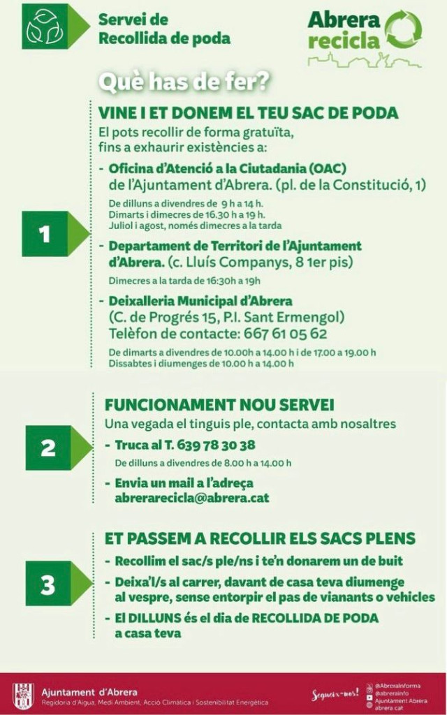 “Continuem treballant per oferir serveis que facilitin la gestió dels residus a la nostra ciutadania. La gran acollida del servei de recollida de poda a domicili, amb un increment tan significatiu en només un any, demostra el compromís dels nostres veïns i veïnes amb el reciclatge i amb un municipi més sostenible. Fer ús d’aquest servei i no deixar la poda a la via pública, al costat dels contenidors o dins del contenidor de l’orgànica ens ajuda a millorar el servei, a fer-lo més eficient i a respectar la via pública i les persones que hi transiten. Volem agraïr a la ciutadania per aquesta implicació i animar tothom a continuar utilitzant aquest servei gratuït i molt còmode, que contribueix a tenir cura del nostre entorn i a millorar la qualitat de vida a Abrera".