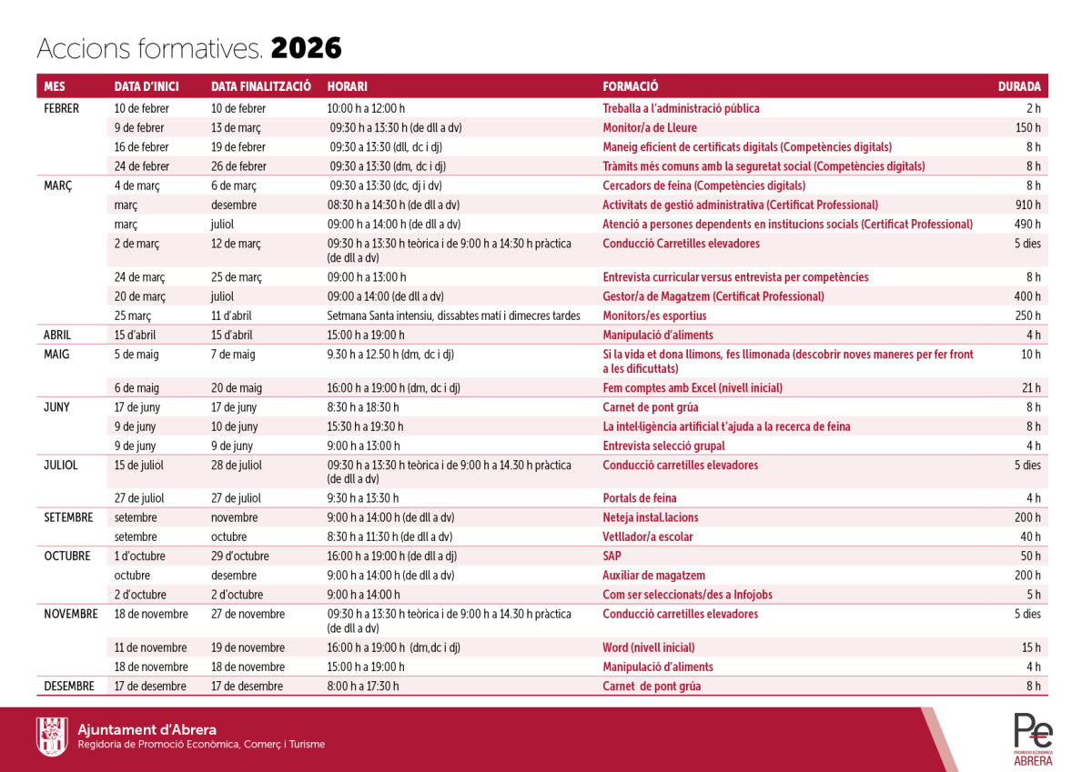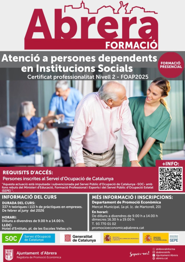 En l'aposta per la formació de la ciutadania, des del Servei de Promoció Econòmica de l'Ajuntament d'Abrera s'ha programat una àmplia oferta formativa gratuïta per a l'any 2026. Dilluns 9 de març de 2026 s'engegarà un curs d'Atenció per a persones dependents en Institucions Socials, amb un total de 450 hores, que permetrà, a l'alumnat que el superi, l'objectiu del Certificat de professionalitat de Nivell 2. El curs s'adreça a persones inscrites al Servei d’Ocupació de Catalunya (SOC) i les inscripcions ja estan obertes. Preneu nota!
