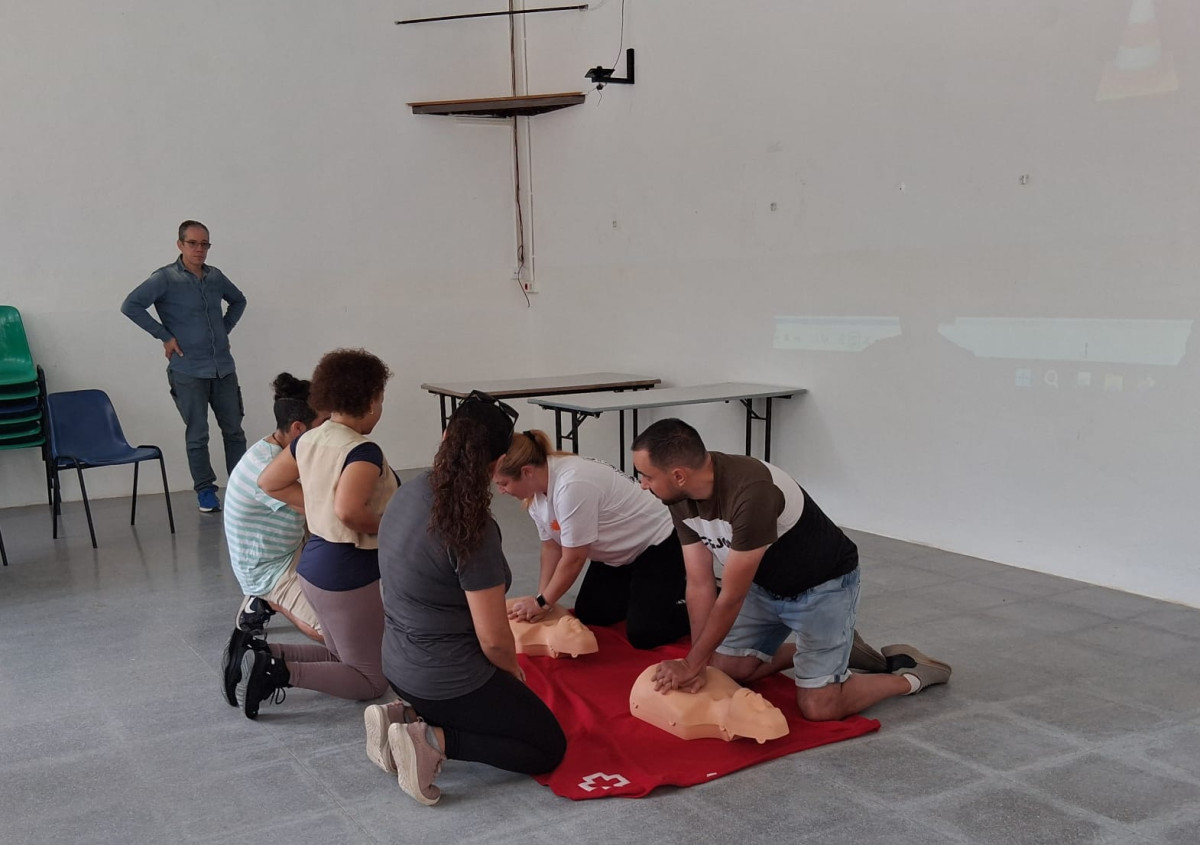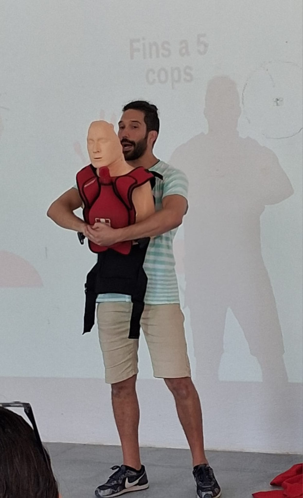 Finalment els i les assistents van posar en pràctica maniobres bàsiques de primers auxilis, com la posició lateral de seguretat (PLS), l'obstrucció de la via aèria per cos estrany (OVACE) i la reanimació cardiopulmonar (RCP) i indicacions per utilitzar un desfibril·lador extern automatitzat (DEA).