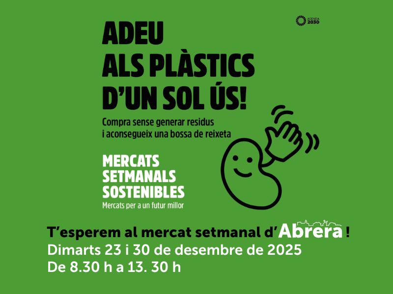 Els mercats setmanals són un pilar del nostre model de comerç de proximitat i garanteixen a la població consumidora una oferta comercial variada i de qualitat. Per aquest motiu, des de l’Ajuntament d’Abrera participem a la campanya de comunicació i sensibilització “Adeu als envasos d’un sol ús als mercats setmanals”, impulsada per la Diputació de Barcelona, amb l’objectiu de conscienciar la ciutadania sobre la necessitat de reduir l’ús d’envasos de plàstic.
