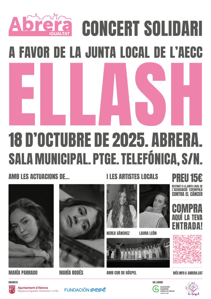 La Fundació Sesé i l'Ajuntament d'Abrera organitzem per primera vegada ELLASH, un esdeveniment solidari que uneix art, reflexió i compromís a favor de la igualtat de gènere per convertir la música en un vehicle de transformació social. La trobada tindrà lloc el proper dissabte 18 d'octubre a partir de les 19.30 h a la Sala Municipal d'Abrera (pl. de Telefònica S/N), amb un format dissenyat per emocionar, conscienciar i celebrar el talent femení. La recaptació de l'esdeveniment es destinarà de forma íntegra a l'Associació Espanyola Contra el Càncer, a través de la Junta local de l'AECC d'Abrera. Podeu comprar la vostra entrada o col·laborar amb la Fila 0 als enllaços que trobareu a continuació. Us hi esperem!