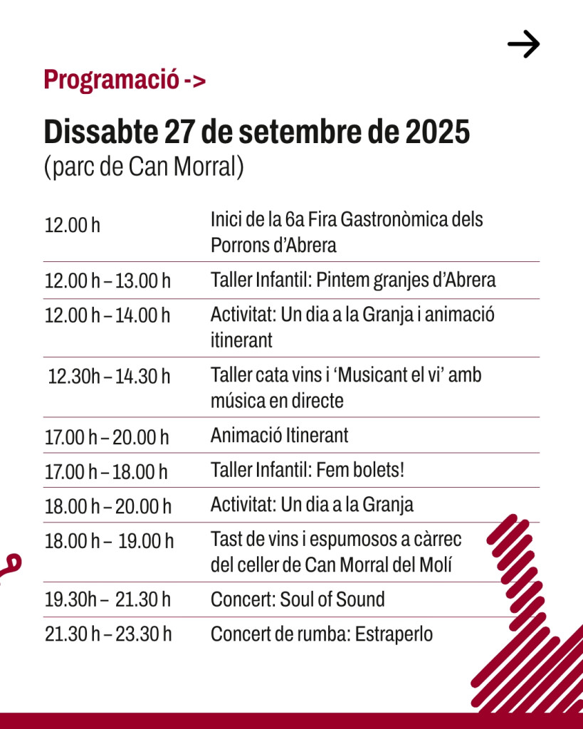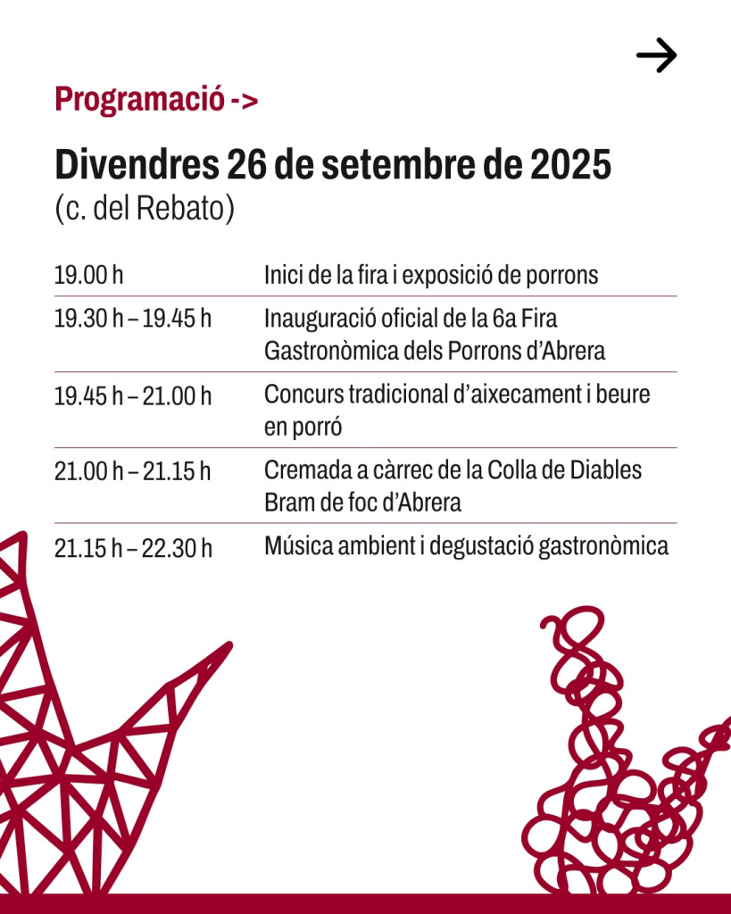 “En aquest mes de setembre, gaudirem de la sisena edició de la Fira Gastronòmica dels Porrons d'Abrera, en la qual podrem gaudir gastronòmicament i culturalment d'infinitat d'activitats, començant el divendres 26 de setembre a la tarda, amb el tradicional concurs de porrons en el Rebato, i el dissabte 27 i el diumenge 28 de setembre ens traslladem al Parc de Ca Morral per a continuar gaudint de diverses activitats”.