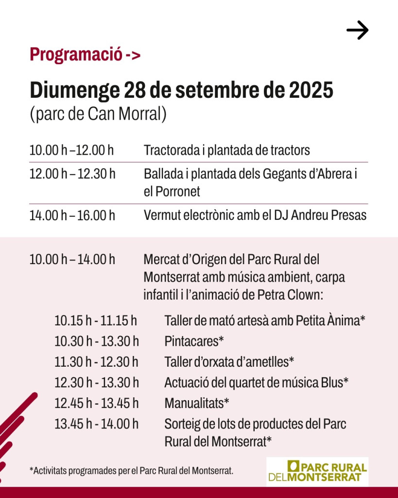 I el cap de setmana, el dissabte 27 i diumenge 28 de setembre, el parc de Can Morral serà el centre de la Fira, amb espais gastronòmics on s’oferiran els plats basats en gastronomia arrelada al territori, amb activitats per al públic familiar, tallers, música, cultura popular i molt més!