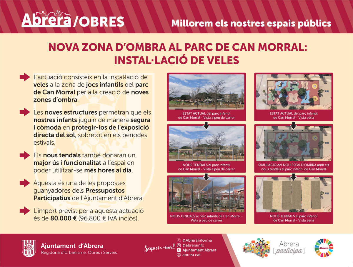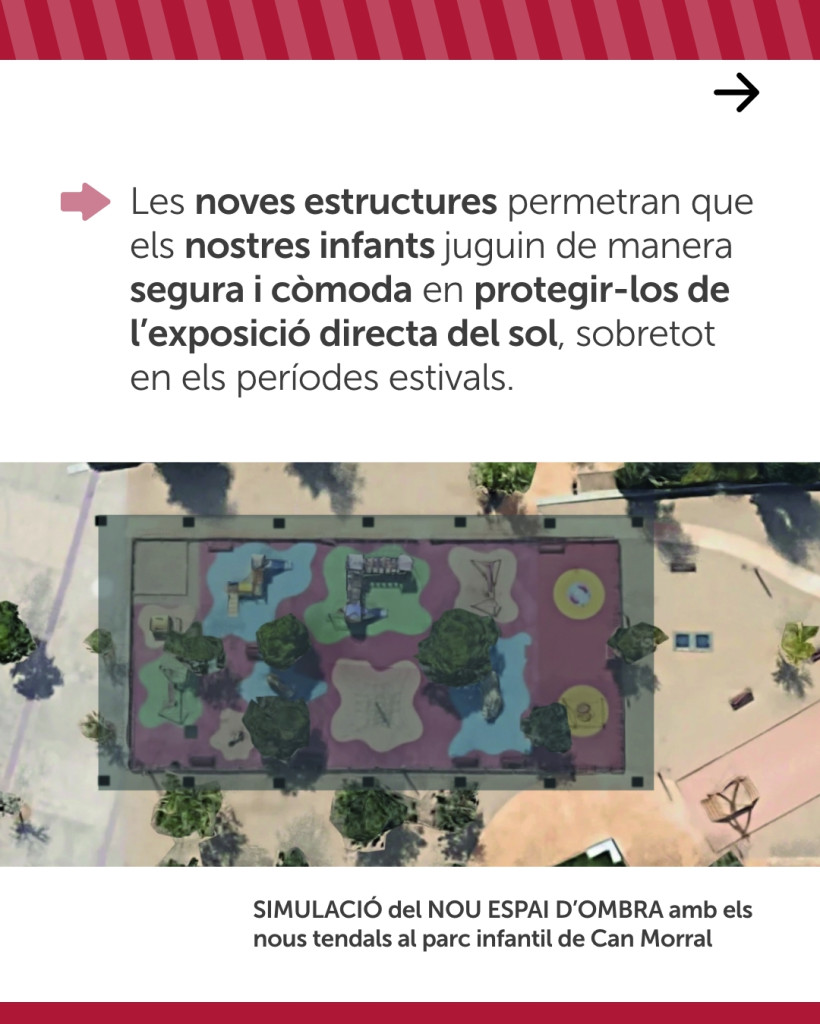 L’actuació consisteix en la instal·lació de veles a la zona de jocs infantils del parc de Can Morral per a la creació de noves zones d’ombra. Les noves estructures permetran que els nostres infants juguin de manera segura i còmoda en protegir-los de l’exposició directa del sol, sobretot en els períodes estivals. Aquests nous tendals també donaran un major ús i funcionalitat a l’espai en poder utilitzar-se més hores al dia.