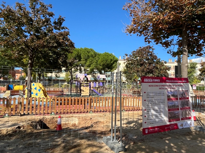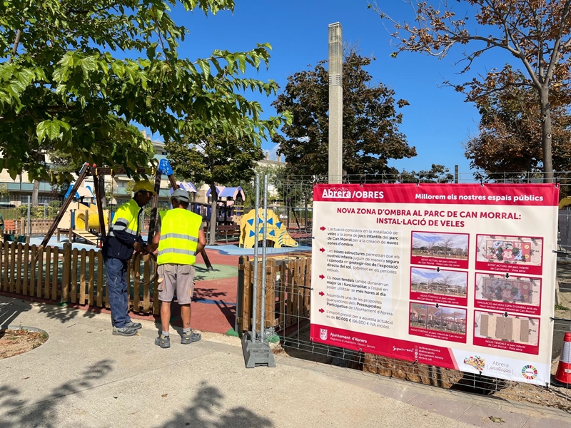 Des de l’Ajuntament d’Abrera s'està duent a terme la instal·lació de veles per a la creació d’ombres, com a refugi climàtic, a la zona de joc infantil del Parc de Can Morral