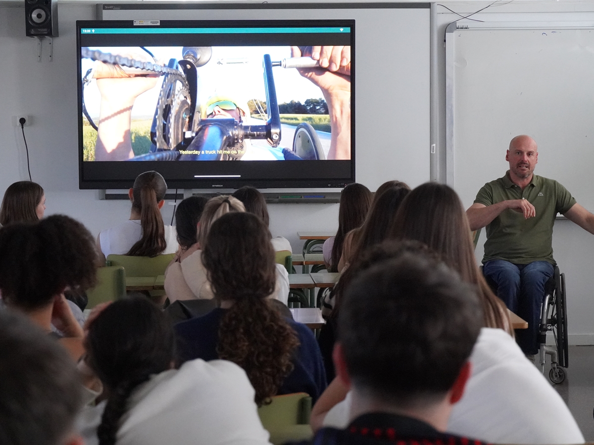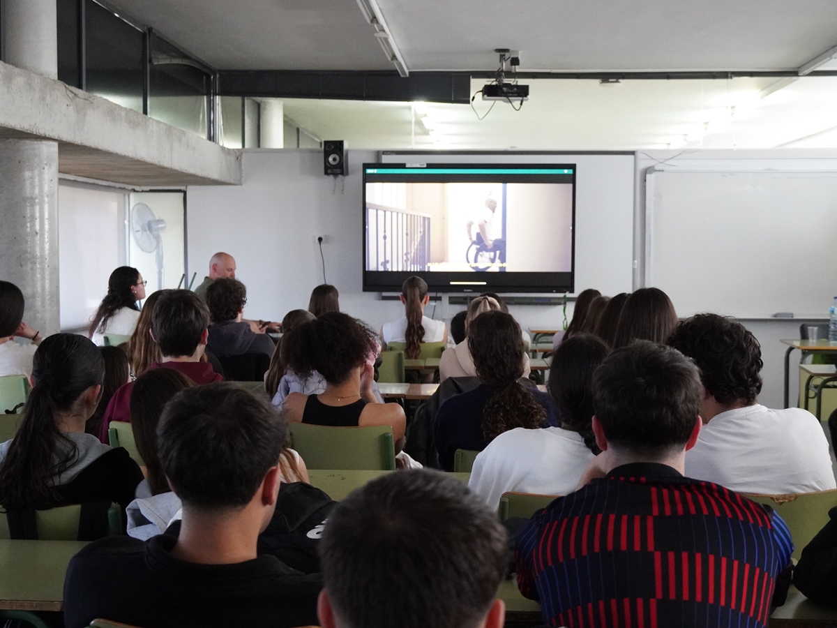 A més, es van projectar diversos vídeos curts que mostraven accidents reals que havien ocasionat lesions medul·lars, provocats principalment per conductes de risc com el consum d’alcohol i estupefaents, les distraccions per l’ús del mòbil durant la conducció o l’excés de velocitat. La sessió també va incloure un testimoni personal, que va explicar l’accident de moto que va patir fa 17 anys i que el va deixar en cadira de rodes, així com un debat posterior amb l’alumnat.
