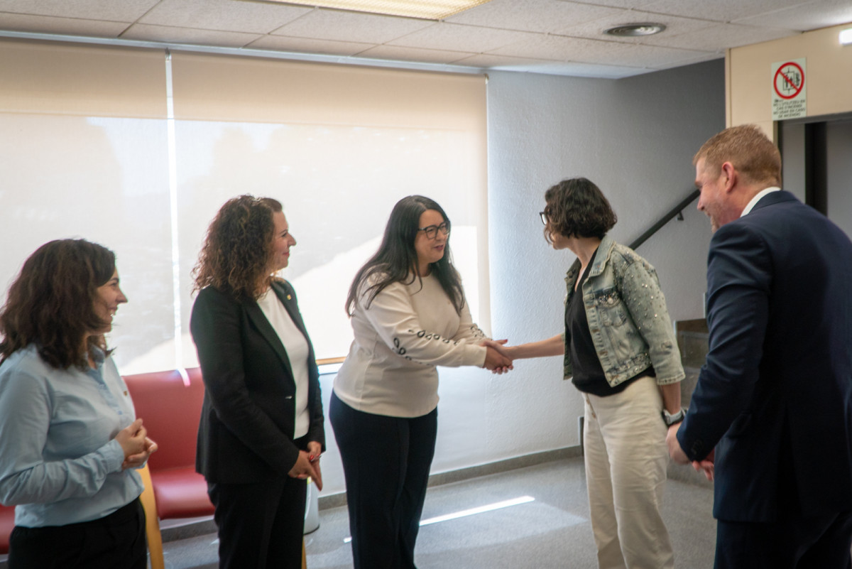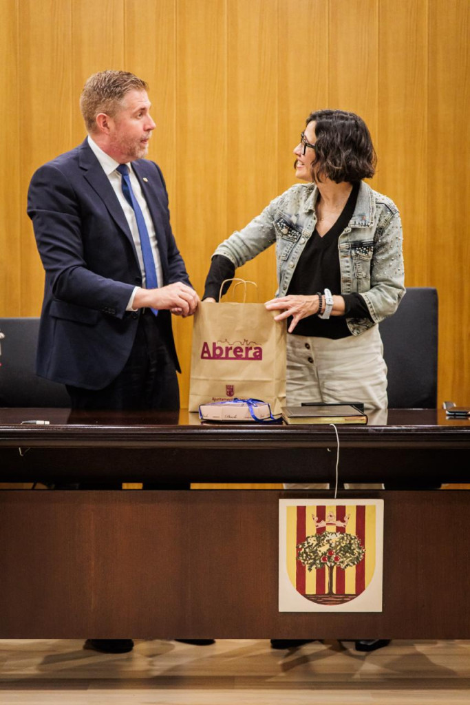 El nostre alcalde Jesús Naharro ha agraït a la consellera Núria Parlon la visita al nostre municipi i li ha lliurat un lot de productes del municipi com els dolços abrerencs i un porró. Seguidament, s'han fet les fotos institucionals de la visita i la reunió de treball.