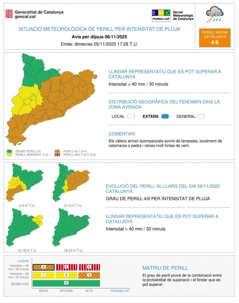 Des de l’Ajuntament d’Abrera es demana a la ciutadania molta precaució i extremar les mesures de protecció davant l’avís del Servei Meteorològic de Catalunya de pluges intenses, que poden afectar Abrera i tota la comarca del Baix Llobregat, durant la jornada d'avui dijous 6 d enovembre de 2025, i poden acumular 40 litres per metre quadrat en 30 minuts.