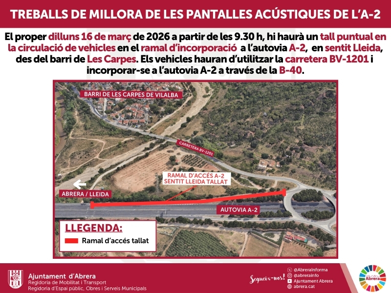 La Demarcació de Carreteres de l’Estat a Catalunya ens ha informat que el proper dilluns 16 de març, a partir de les 9.30 h, es tallarà puntualment el ramal d’incorporació a l’autovia A-2 en sentit Lleida, des del barri de Les Carpes d’Abrera, al punt quilomètric 588. El motiu son els treballs de millora de les pantalles acústiques instal·lades prèviament per part del Ministeri de Transport, Mobilitat i Agenda Urbana (Mitma).