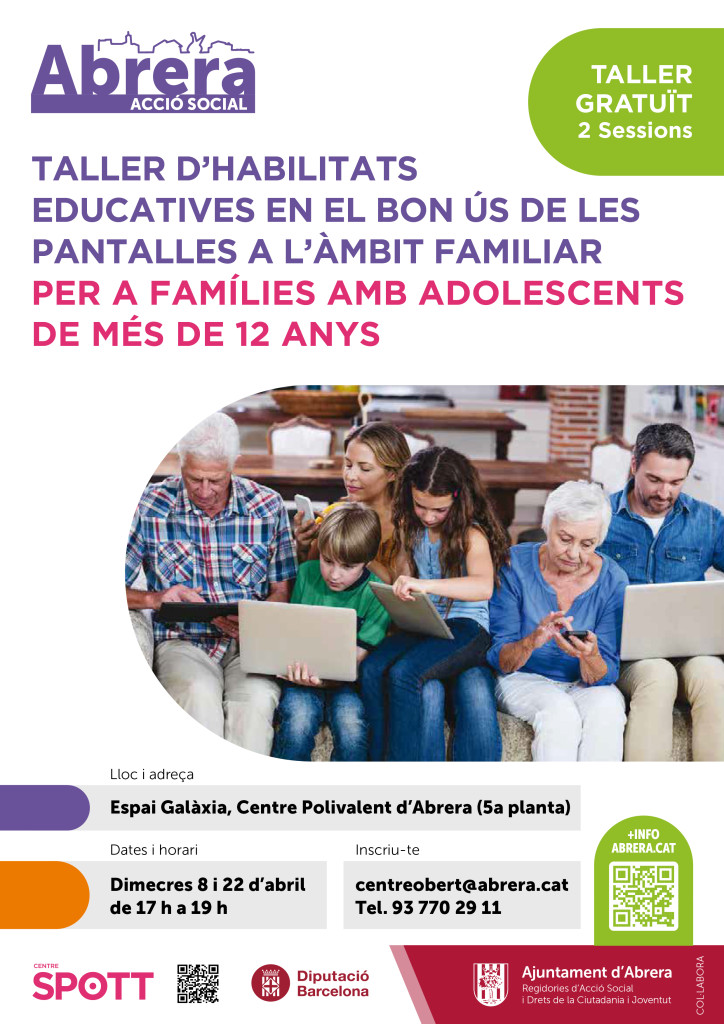 Des de l’Ajuntament d’Abrera, mitjançant les regidories d’Acció Social i Drets de la Ciutadania i Joventut, hem organitzat un taller gratuït d’habilitats educatives adreçat a famílies amb adolescents majors de 12 anys per promoure un bon ús de les pantalles a l’àmbit familiar. L’activitat es durà a terme a l’Espai Galàxia, situat al Centre Polivalent d’Abrera (pl. del Rebato, cinquena planta), i constarà de dues sessions programades pels dimecres 8 i 22 d’abril, en horari de 17 h a 19 h. Cal fer inscripció prèvia a través del correu electrònic centreobert@abrera.cat o trucant al T. 93 770 29 11.