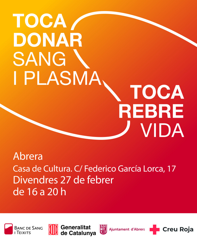 El proper divendres 27 de febrer de 2026 es durà a terme a Abrera una nova campanya de donació de sang i plasma, sota el lema 'Toca donar sang i plasma. Toca rebre vida!'. Des de l'Ajuntament d'Abrera, juntament amb l'Àrea de Promoció de la Donació del Banc de Sang i Teixits, impulsem una nova campanya de donació de sang i plasma al municipi per tal que els veïns i veïnes s'apropin i facin les seves donacions.