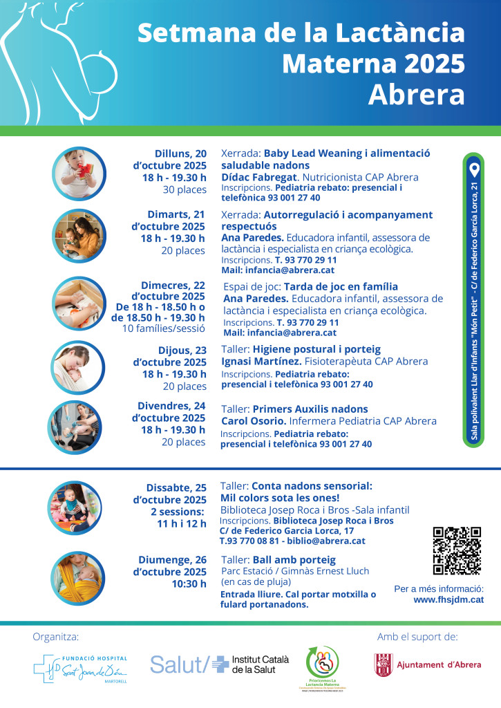 Un any més, Abrera ha visibilitzat aquest mes d'octubre l'alletament matern i enguany, la Setmana de la Lactància Materna 2025 va tenir lloc del dilluns 20 al diumenge 26 d’octubre. La Setmana de la Lactància Materna és una iniciativa organitzada per la Fundació Hospital Sant Joan de Déu de Martorell (FHSJDM) i inclou totes les poblacions de l’àrea d’influència de l’hospital. Per donar més visibilitat a l’alletament matern, la FHSJDM, juntament amb l’ASSIR  i els EAP Baix Llobregat Centre i Nord – Gerència d’Atenció Primària a la Comunitat Baix Llobregat i amb el suport dels Ajuntaments del Baix Llobregat Nord, s’han unit de nou per a promoure la lactància materna. A Abrera, les activitats es van dur a terme a l'Escola Bressol Municipal Món Petit (Federico Garcia Lorca, 21 - c. Antoni Gaudí, 4), a la Biblioteca Josep Roca i Bros (c. de Federico García Lorca, 17) i al Parc de l'Estació, amb gran èxit d'assistència a totes elles. Gràcies, Abrera!