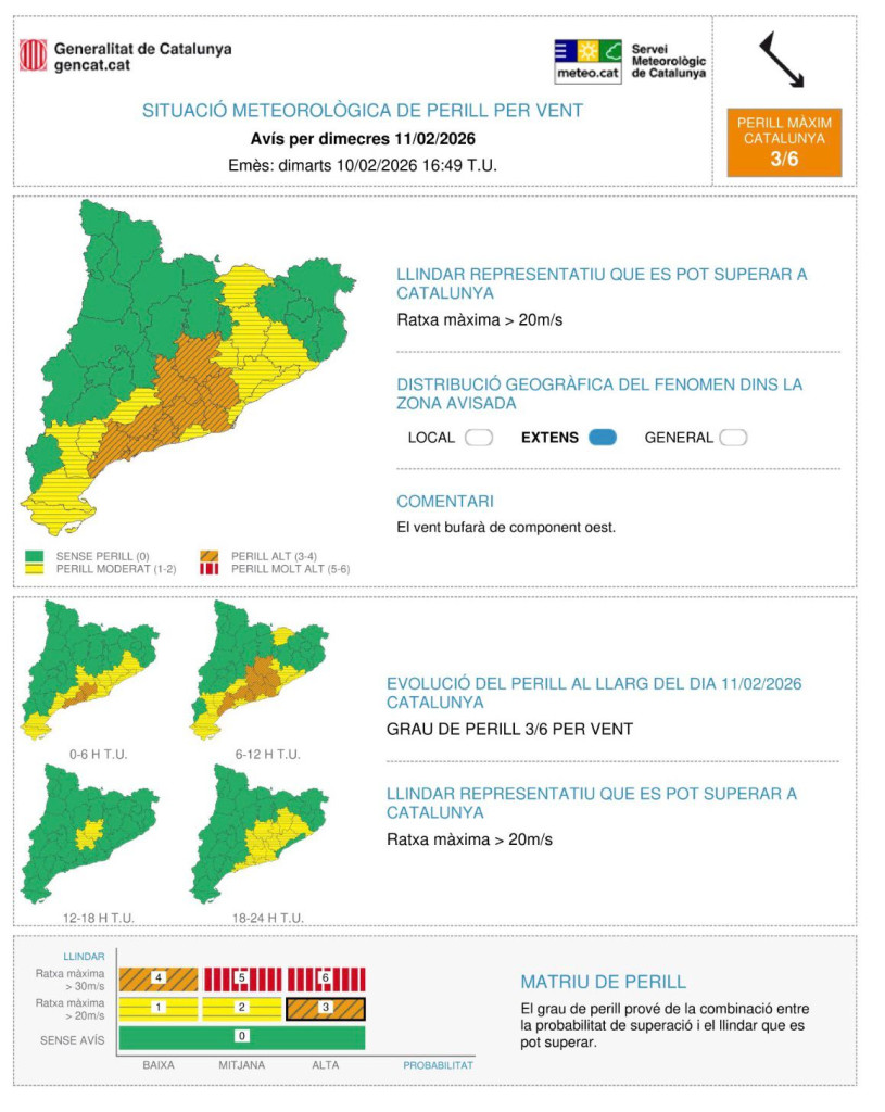 • Avís per fort vent per dimecres 11 de febrer de 2026