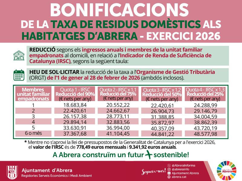 Abrera + Sostenible! Des de l'Ajuntament d'Abrera oferim bonificacions en taxes municipals per facilitar el compliment de les obligacions econòmiques de la ciutadania. La taxa de residus domèstics, amb una quota anual per cada habitatge del nostre municipi de 228 €, presenta reduccions per ingressos econòmics anuals, que poden arribar al 90% i que el 2026 beneficiaran més famílies abrerenques amb l'ampliació del barem econòmic per accedir-hi, i bonificacions per l'ús de la Deixalleria Municipal, que poden arribar al 25%.