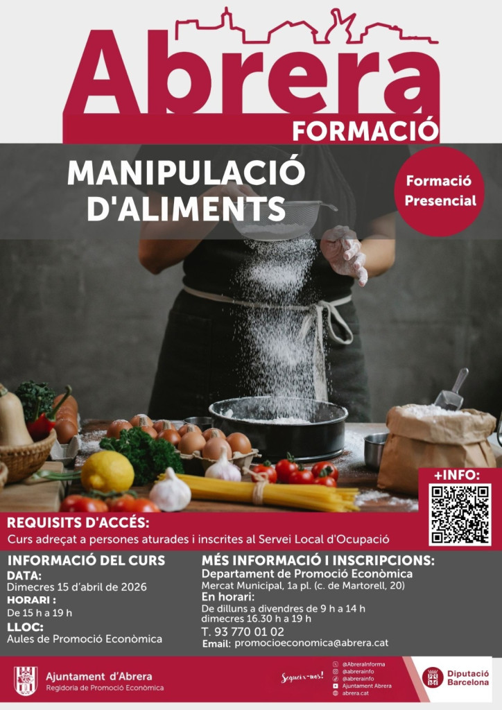 En l'aposta per la formació de la ciutadania, des del Servei de Promoció Econòmica s'ha programat una àmplia oferta formativa gratuïta per a l'any 2026. Dimecres 15 d'abril de 2026, de 15.00 h a 19.00 h, s'impartirà un curs de 'Manipulació d'aliments' adreçat a persones aturades i inscrites en el Servei Local d’Ocupació (SLO) d’Abrera.