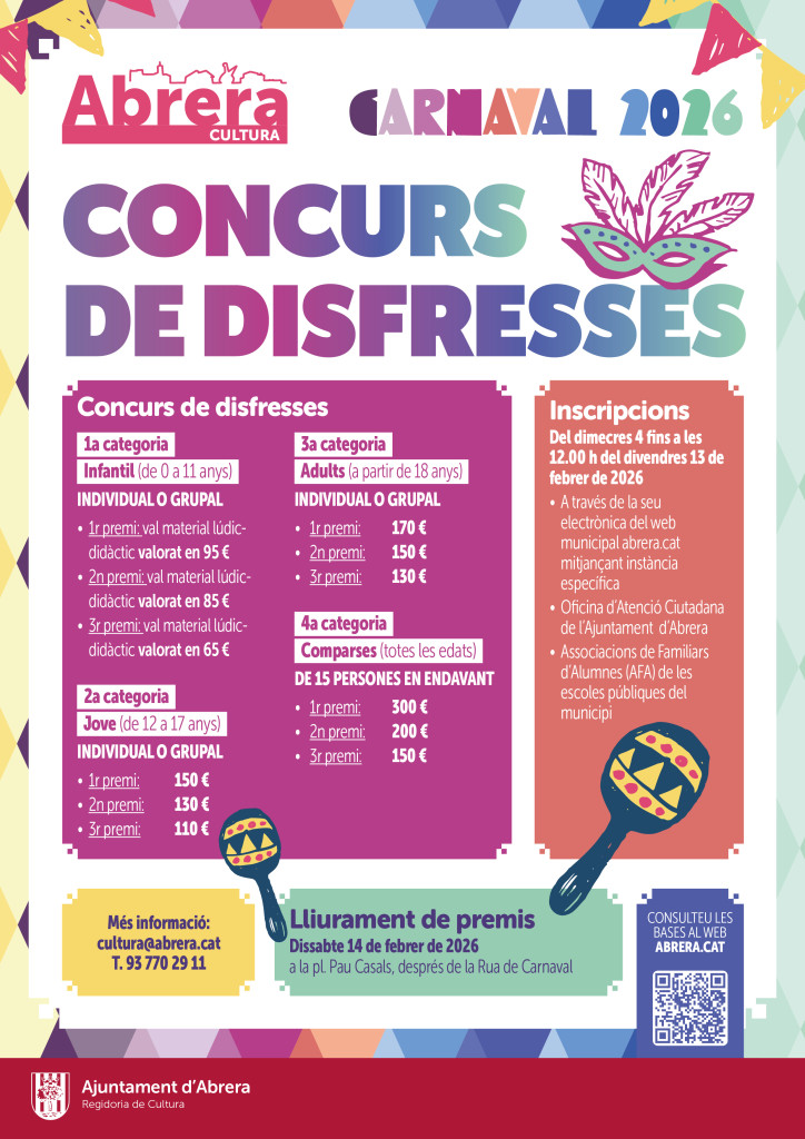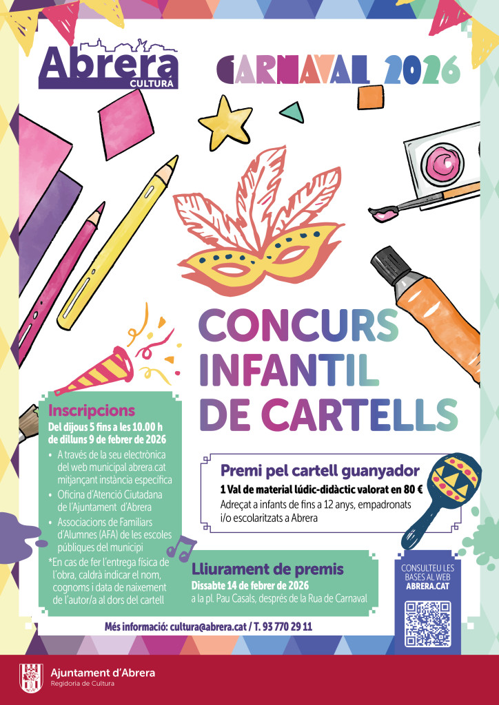 A Abrera torna el Carnaval! Des de l'Ajuntament d'Abrera felicitem l'abrerenca Lucía Pineda Crespo, de 12 anys i alumna de l'Institut Voltrera d'Abrera, per ser la guanyadora del Concurs de Cartells de Carnaval 2026. Enhorabona! Des del consistori organitzem les activitats de Carnaval amb la col·laboració de la Comissió de Carnestoltes. Recordem que fins a les 12.00 h del divendres 13 de febrer de 2026, us podreu apuntar al Concurs de Disfresses.